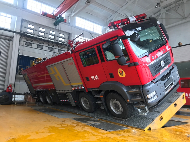 車輛底盤為汕德卡ZZ5446V516MF5底盤,發(fā)動(dòng)機(jī)型號(hào):MC13.54-61,功率:400kw,國(guó)六排放標(biāo)準(zhǔn),軸距:1950+4500+1400mm,罐體材質(zhì):優(yōu)質(zhì)不銹鋼304,容罐容量:水10000kg,泡沫5000kg,干粉罐額定充裝量:3000kg,消防泵為8FGR-美國(guó)Hale(希爾),消防炮為泡沫水兩用炮,型號(hào)為DICODOPLUS 150法國(guó)POK博克,干粉炮為萃聯(lián)PF40,照明系統(tǒng)為星際,主照明燈功率:600W×4 整車由底盤、罐體、箱體、管路、干粉氮?dú)庀到y(tǒng)、照明系統(tǒng)等主要結(jié)構(gòu)組成,罐體采用優(yōu)質(zhì)不銹鋼304。設(shè)計(jì)厚度:4:4:3(底板:側(cè)板:防蕩板);箱體主骨架為優(yōu)質(zhì)型鋼,蒙板為優(yōu)質(zhì)氧化鋁合金平板粘接結(jié)構(gòu)。全鋼框架焊接結(jié)構(gòu),左右后三側(cè)為鋁合金卷簾門,車身右后側(cè)設(shè)上爬梯,下設(shè)防滑翻轉(zhuǎn)踏板。器材箱內(nèi)骨架采用鋁合金型材內(nèi)藏式搭接技術(shù),可提高空間利用率和可變性,內(nèi)部底板采用鋁花紋板,內(nèi)蒙板與框架之間采用粘接技術(shù)(無鉚釘)。管路系統(tǒng)由外進(jìn)水管路、內(nèi)進(jìn)水管路、出水管路、注液管路、泡沫管路、放余水管路、冷卻水管路、全自動(dòng)泡沫比例混合器組成。干粉罐材質(zhì)為16MnR,配有裝粉口、排粉口、氮?dú)廨斔凸芎统龇酃?,罐?nèi)氮?dú)廨斔凸転榄h(huán)行并配多個(gè)進(jìn)氣閥,使氣體與干粉混合均勻呈流態(tài)。
